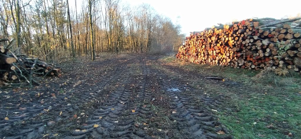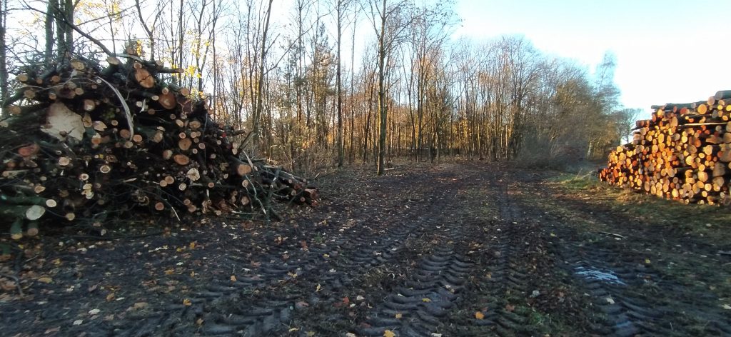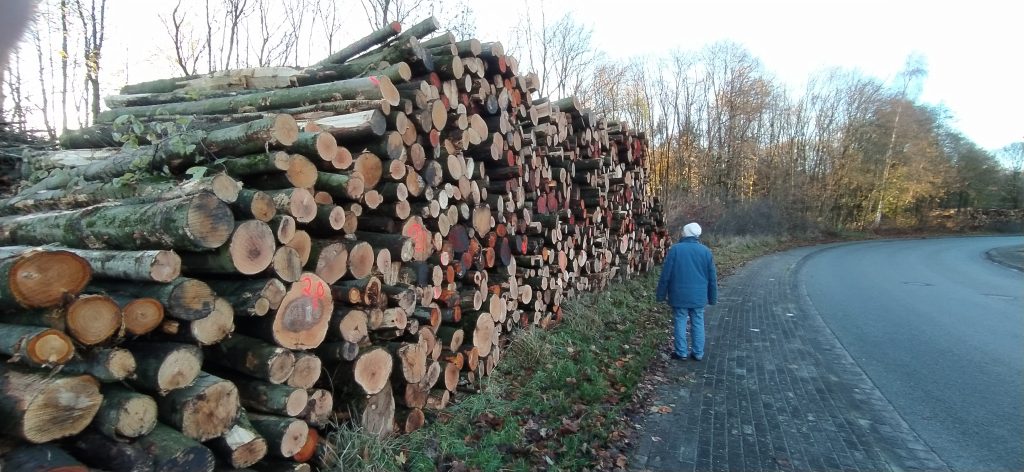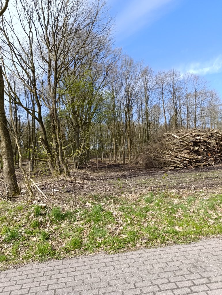 Es gab keine Pressemitteilung über Grund und Umfang dieses Kahlschlages. In einer Ausschusssitzung gab der Bauamtsleiter, Herr Maass, zu Protokoll, man habe „Totholz entfernt“ . Tatsächlich aber zeigte sich uns ein kümmerlicher Restwald, „besenrein“ ausgeräumt und hohe Holzstapel am Wegesrand. Der wertvolle Waldrandgehölzbestand, Lebensraum der streng geschützten Haselmaus, wurde fast total entfernt. Eine zu erhaltende Baumreihe wurde schwer beschädigt, die vorgeschriebenen Schutzrandstreifen von Harvestern als Rückegassen planiert.